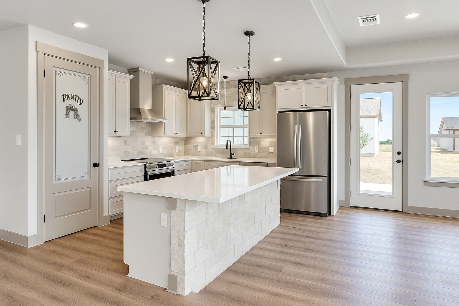 Chef-Inspired Kitchen: Includes a large island, walk-in pantry, and easy access to the mudroom and utility areas.